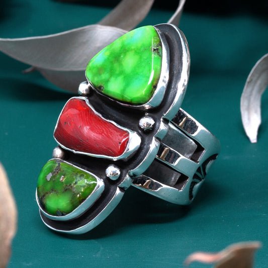 Sonoran Gold Turquoise & Coral Ring with Stamped Silver Band | Tommy & Marie Jackson | Size 8
