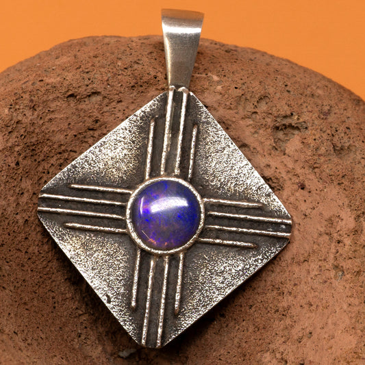 Cast Silver Zia Symbol Pendant with Blue Spiderweb Opal