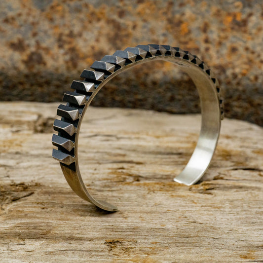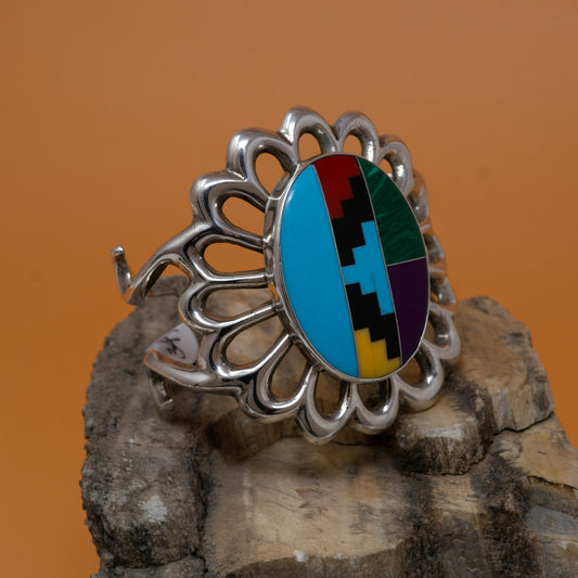 Vintage Flower Sandcast Cuff Bracelet with Malachite, Sugilite, Turquoise, Onyx and Spiny Oyster set in Sterling Silver