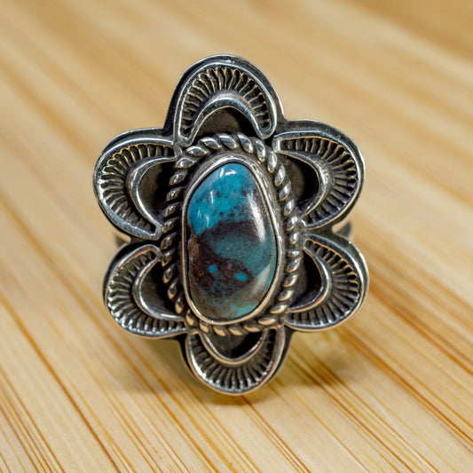 Turquoise Set in Ornate Silver Ring | Size 8.5