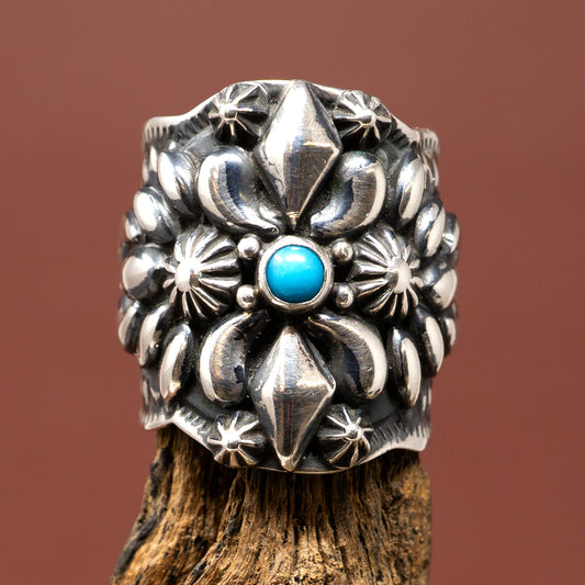 Turquoise Cabochon Zia Pattern Cast Sterling Ring | Size 6.5