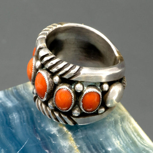 Coral Cabachon & Sterling Silver Ring by Calvin Martinez | Size 8.5