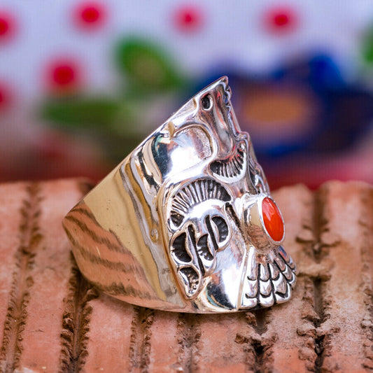 Coral & Sterling Silver Thunderbird Ring Size 9