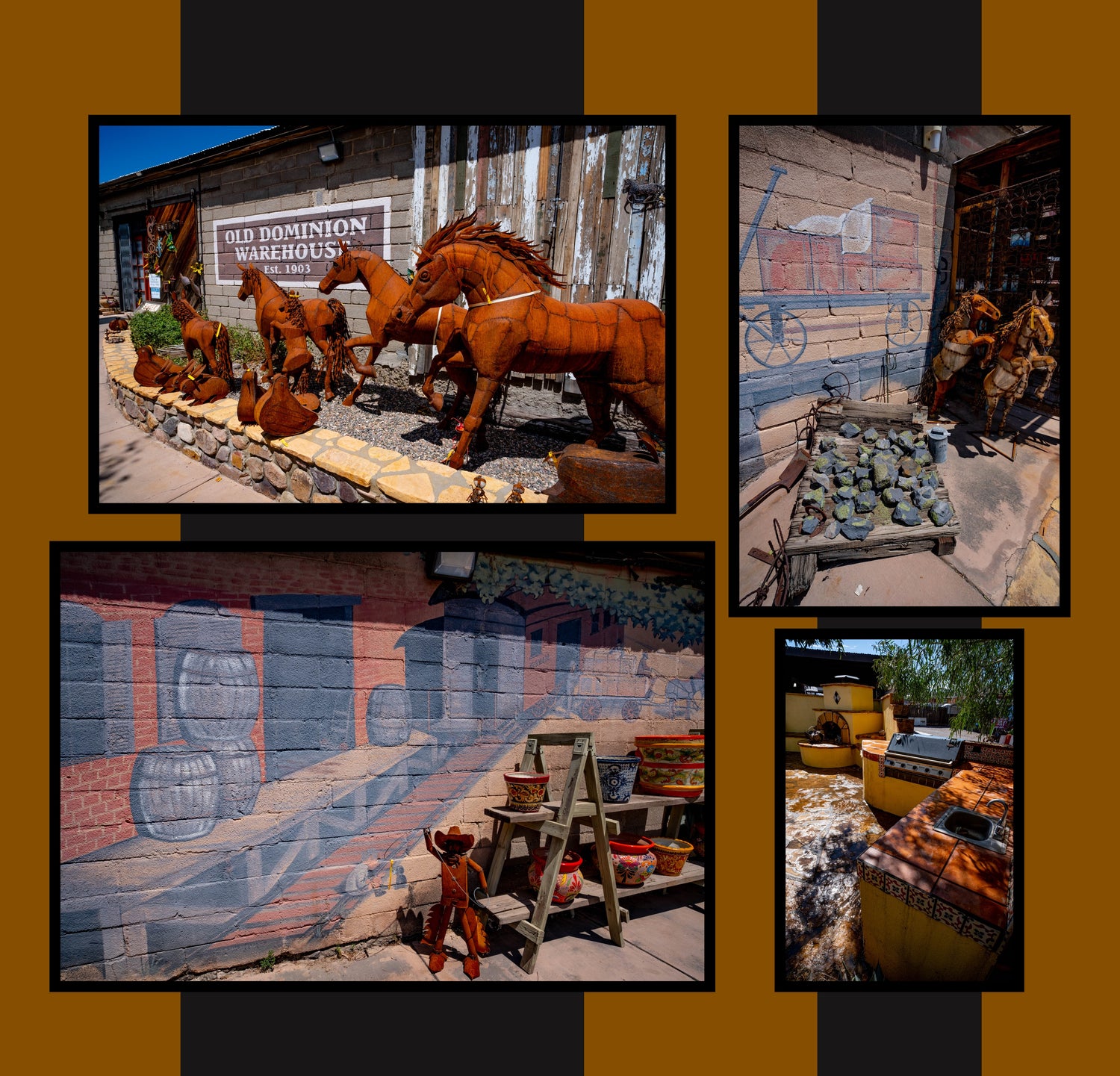 Today, the patio serves as both a place to entertain as well as an outdoor extension of the shop. The mural on the west exterior wall of the building depicts a turn-of-the-century warehouse scene.