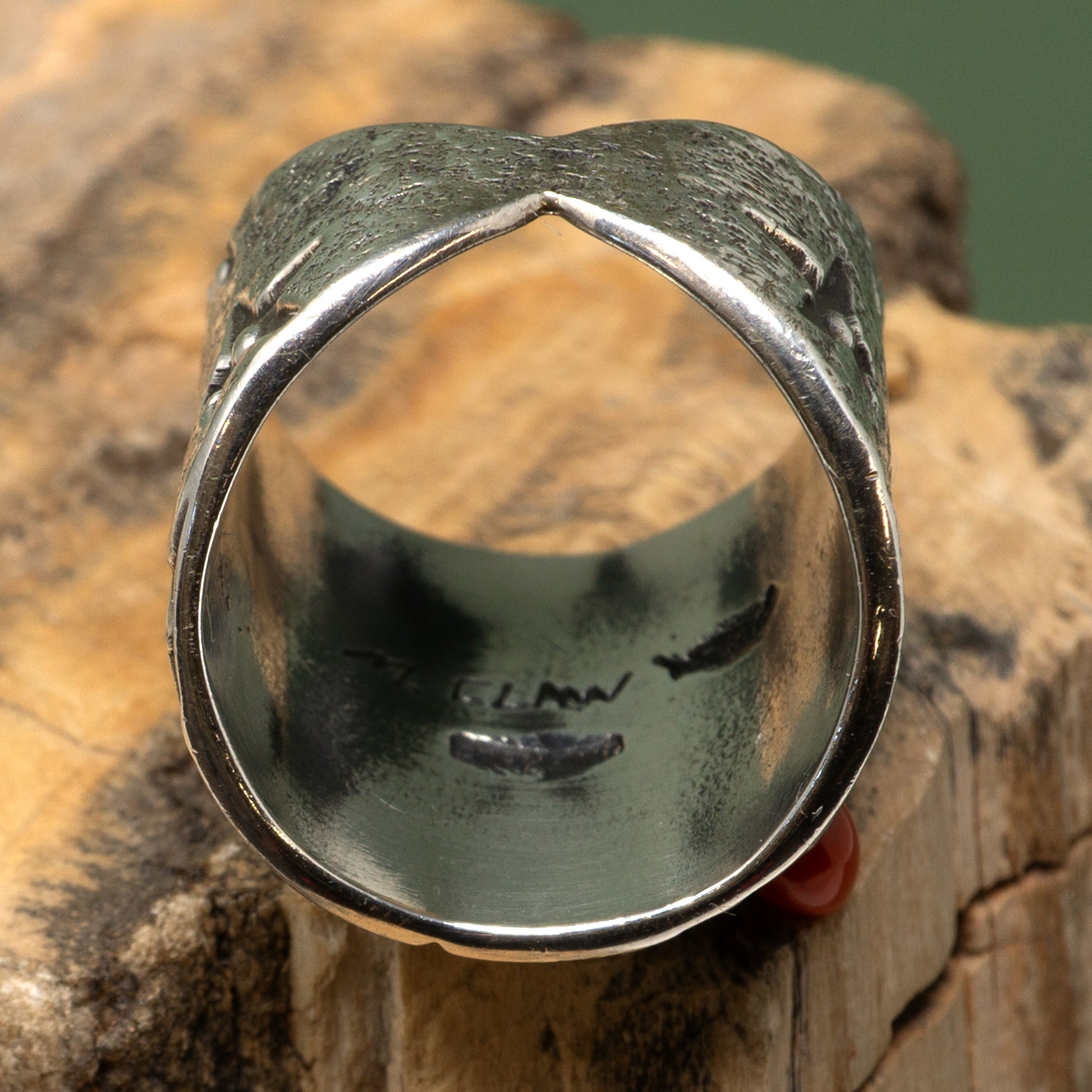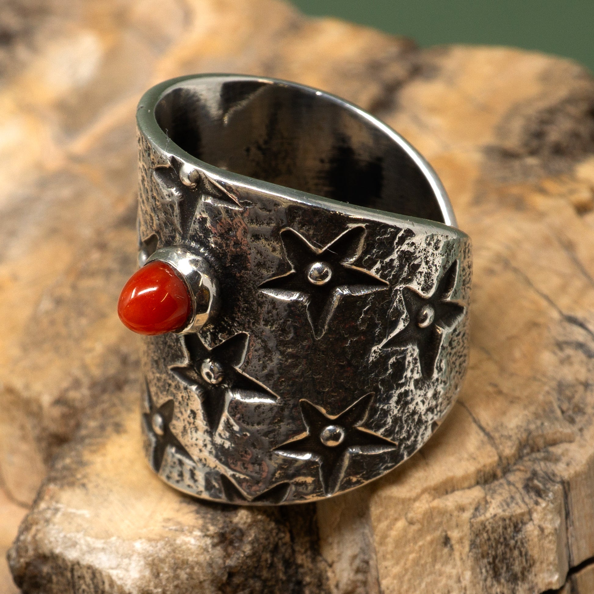 Coral in Cast Sterling Silver Star-Patterned Ring by Monty Claw | Size 7.75