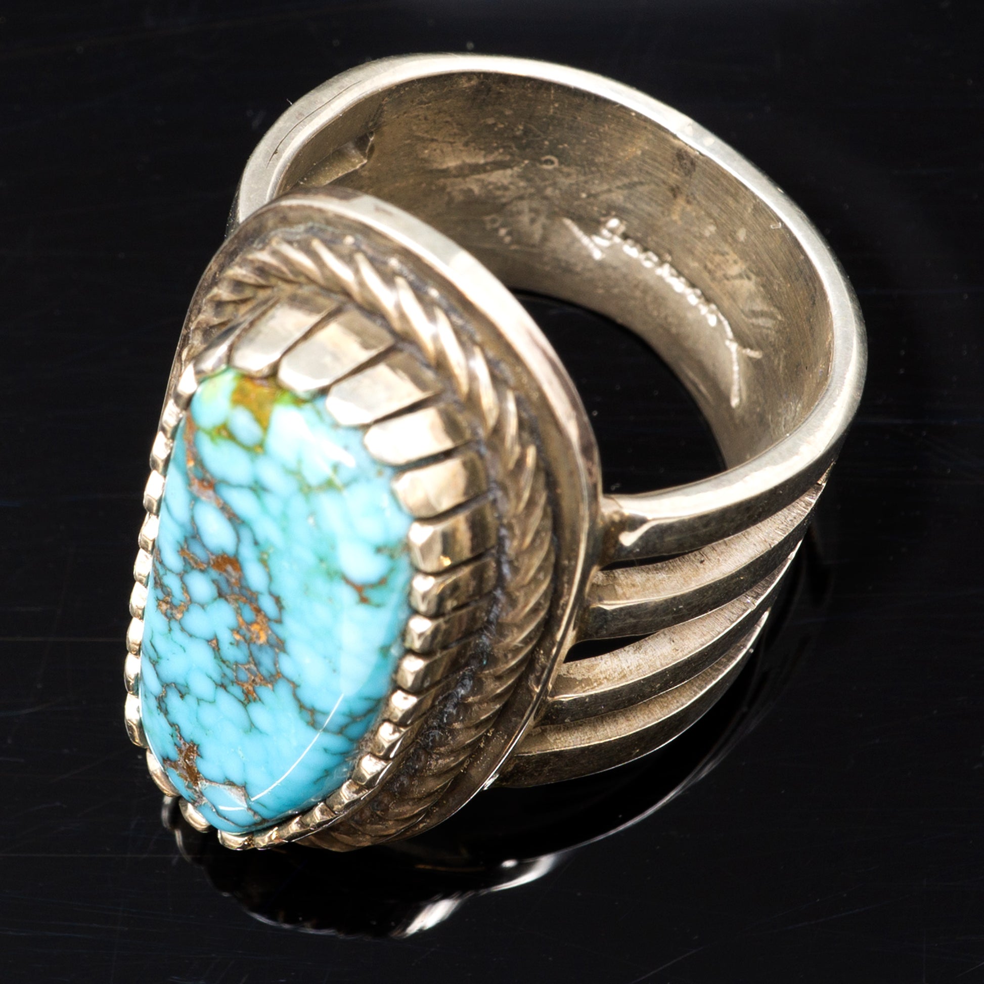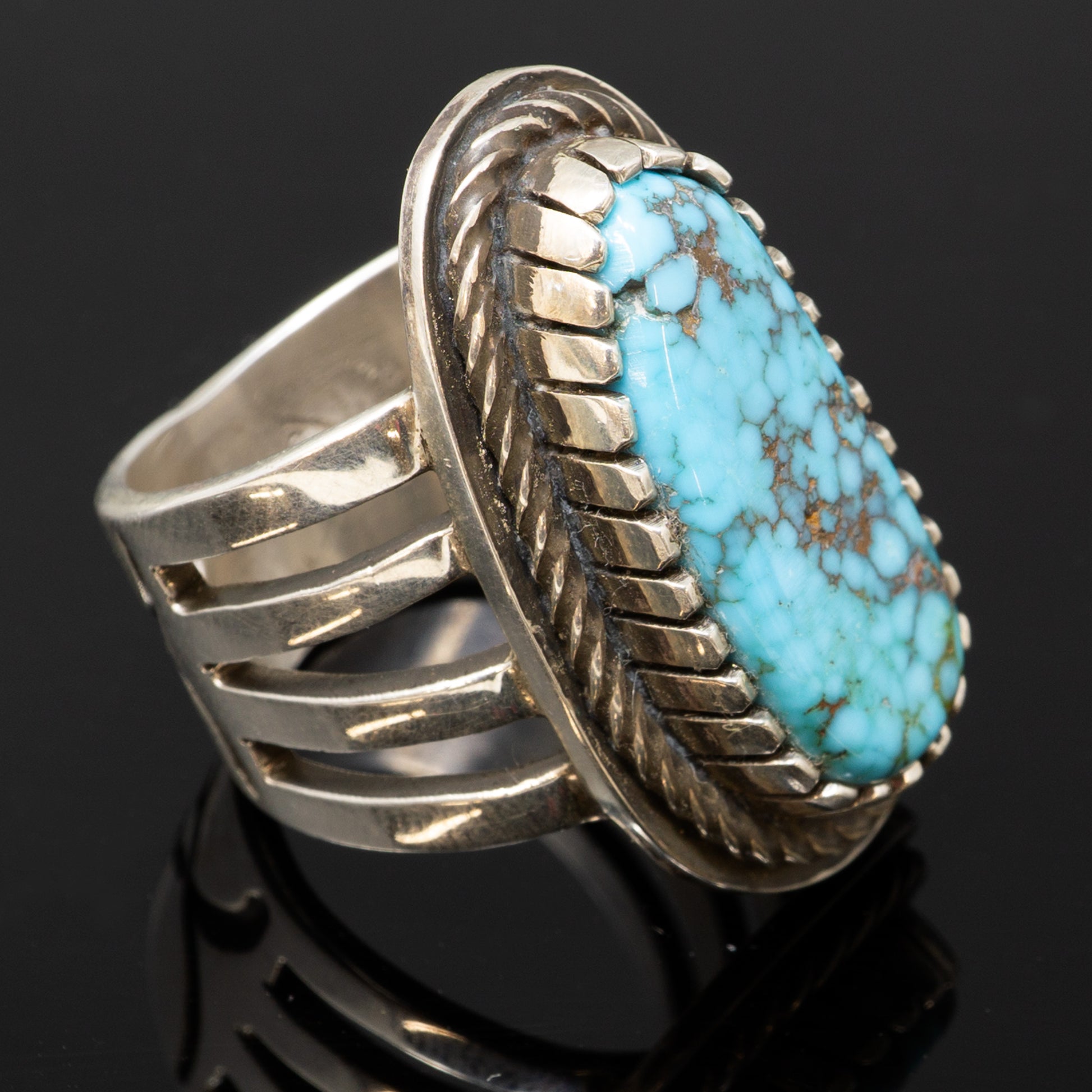 Turquoise Ring with Indian Mountain Cabochon set on a Wide Overlay Silver Band