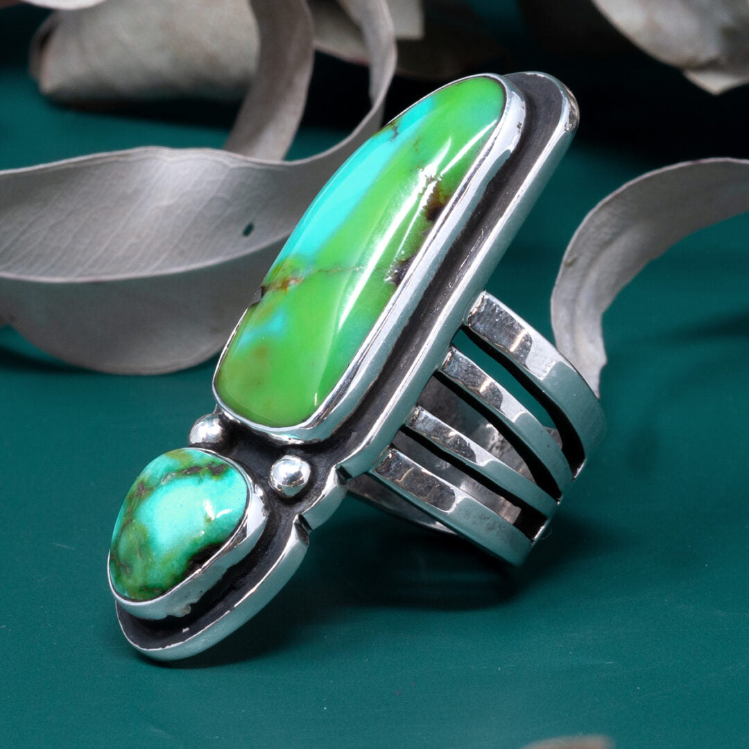 Sonoran Gold Turquoise Two Cabochon Ring with Stamped Silver Band | Tommy & Marie Jackson | Size 9