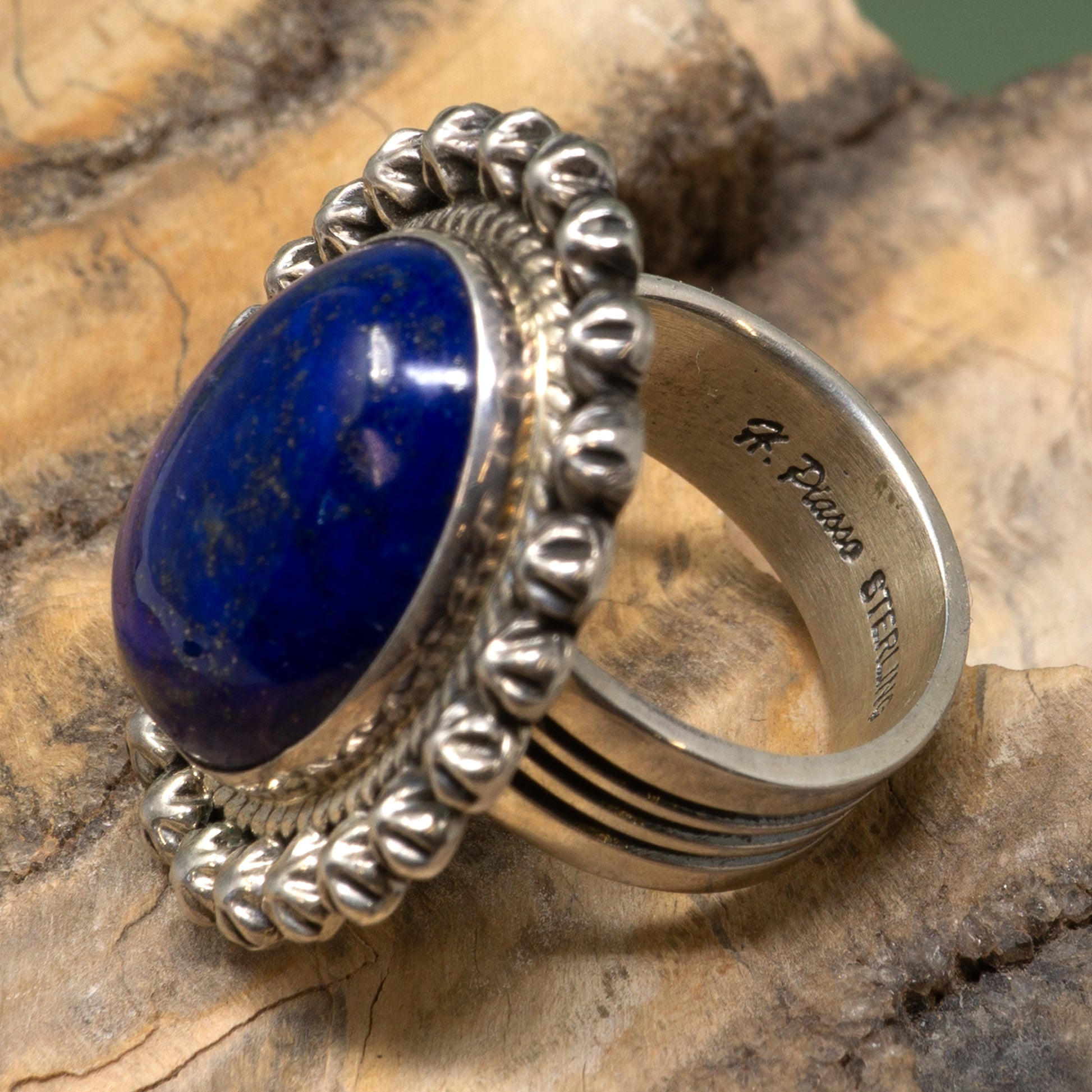 Two types of lapis are usually seen in Native American art and jewelry: lapis lazuli and denim lapis. Lapis lazuli is a deep blue semi-precious stone that's revered for its intense color. Denim lapis is a paler blue, similar to the color of faded denim. Clean with a soft, dry cloth to maintain shine.