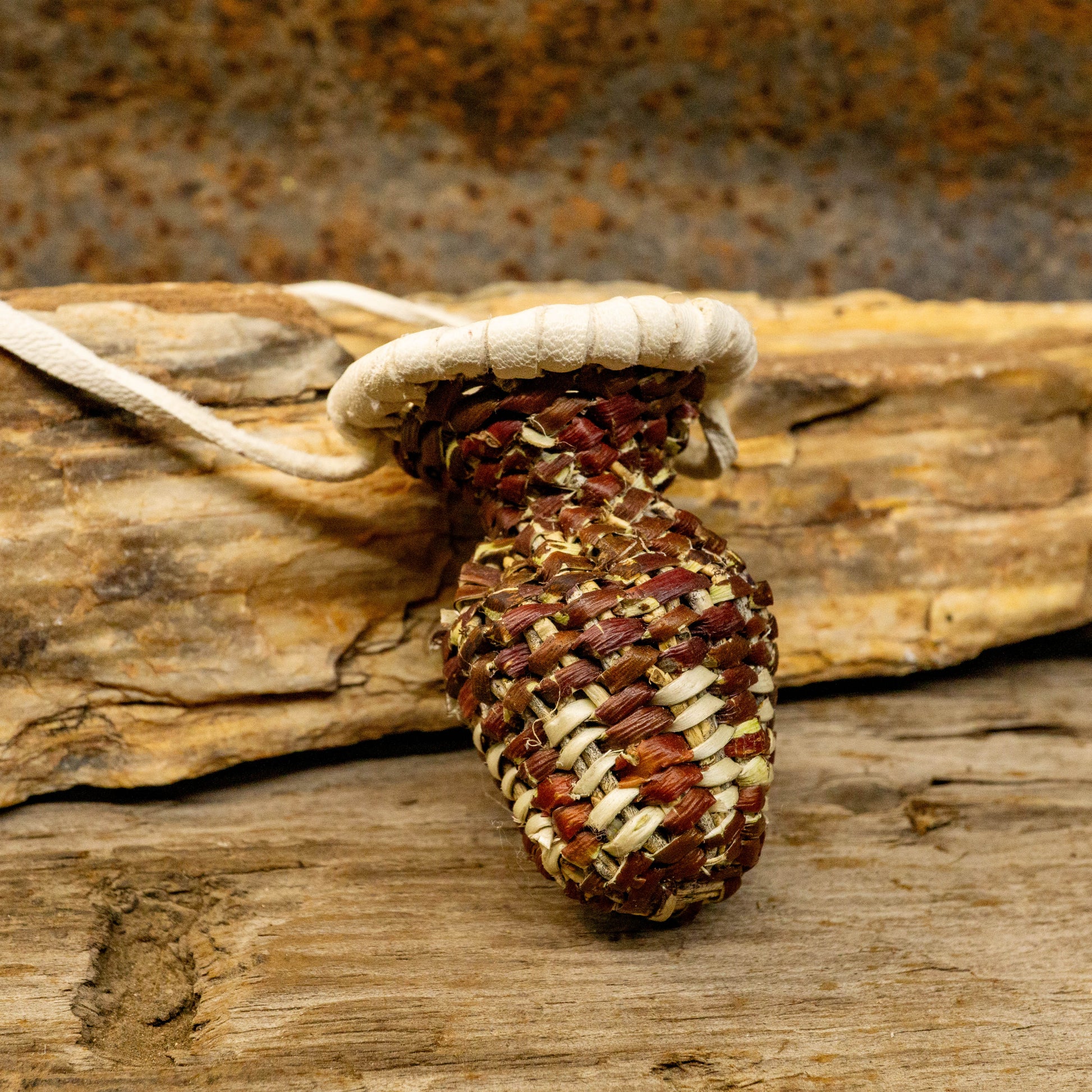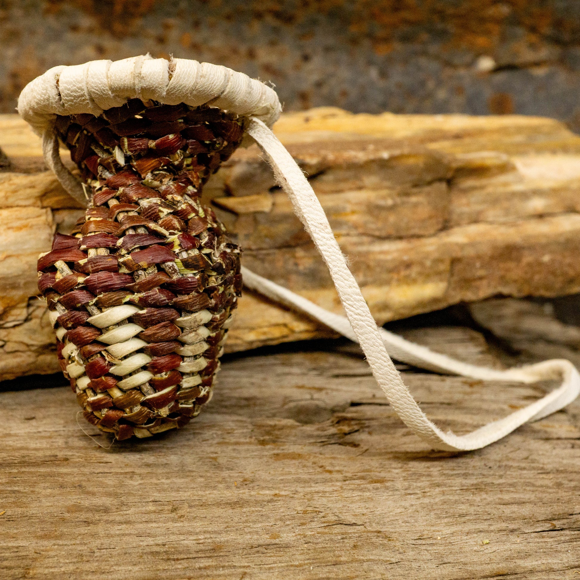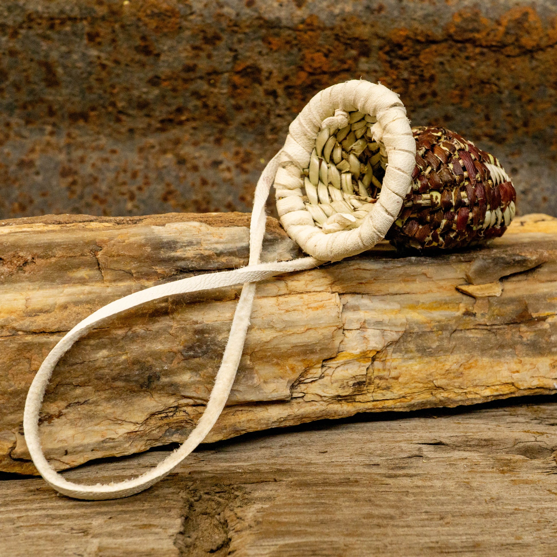Apache burden baskets are cone shaped, with flat or rounded bottoms. Buckskin and cone jingles made of tin are added to enhance the basket. Nearly all baskets will have a buckskin carry strap, which was once worn around the forehead or shoulders. The baskets were once made for everyday use in collecting or gathering wild foods or to cultivate crops like corn. Large burden baskets were sometimes made for food storage. As the baskets were carried, the tin cones would jingle and scare off snakes. Small baskets were given to children and the jingling alerted parents to where the children were. It is said that these are hung outside a home and visitors are to place their burdens in the basket before entering the home. The saying “leave your burdens at the door” originated with these baskets.