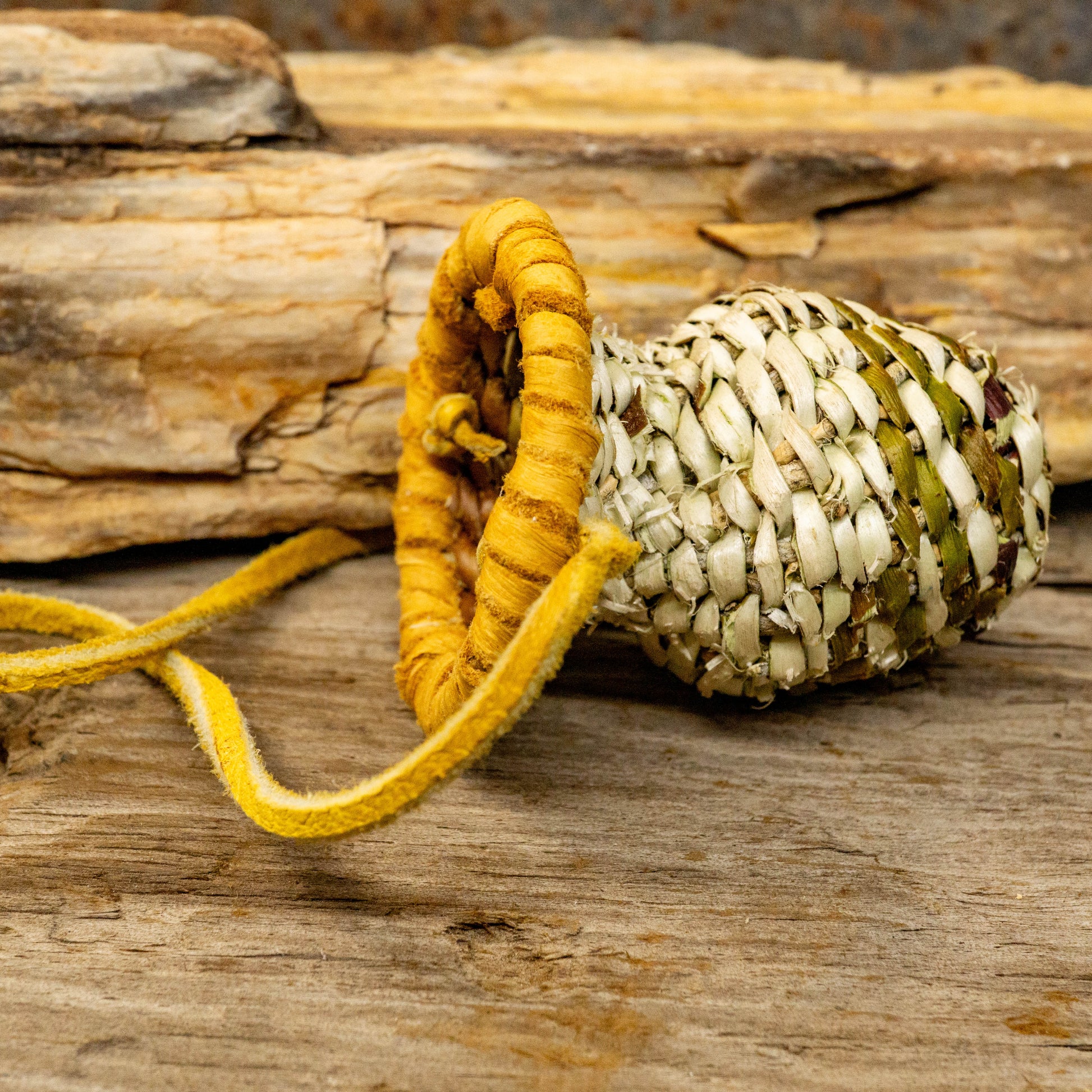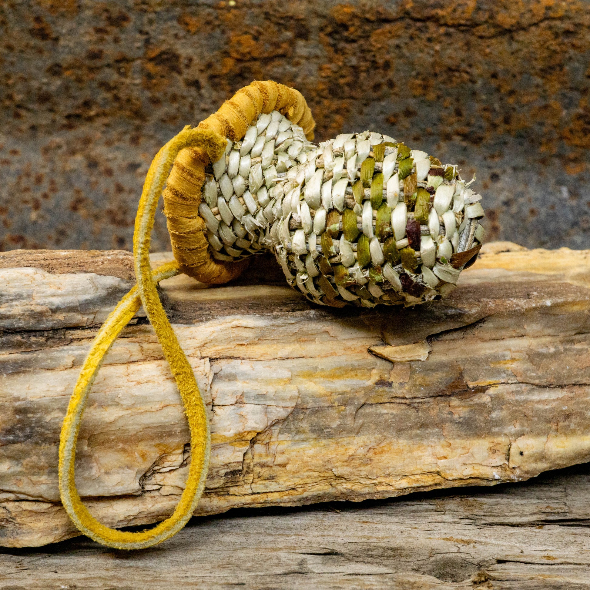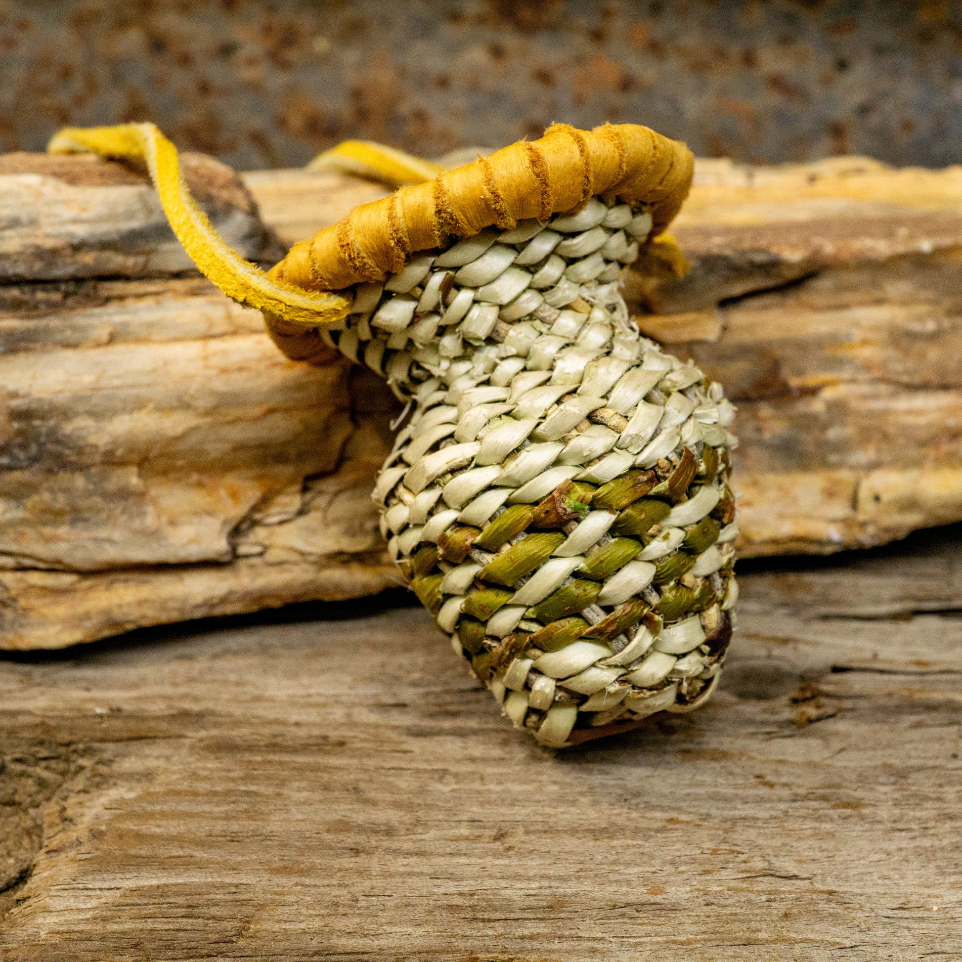 Apache burden baskets are cone shaped, with flat or rounded bottoms. Buckskin and cone jingles made of tin are added to enhance the basket. Nearly all baskets will have a buckskin carry strap, which was once worn around the forehead or shoulders. The baskets were once made for everyday use in collecting or gathering wild foods or to cultivate crops like corn. Large burden baskets were sometimes made for food storage. As the baskets were carried, the tin cones would jingle and scare off snakes. Small baskets were given to children and the jingling alerted parents to where the children were. It is said that these are hung outside a home and visitors are to place their burdens in the basket before entering the home. The saying “leave your burdens at the door” originated with these baskets.