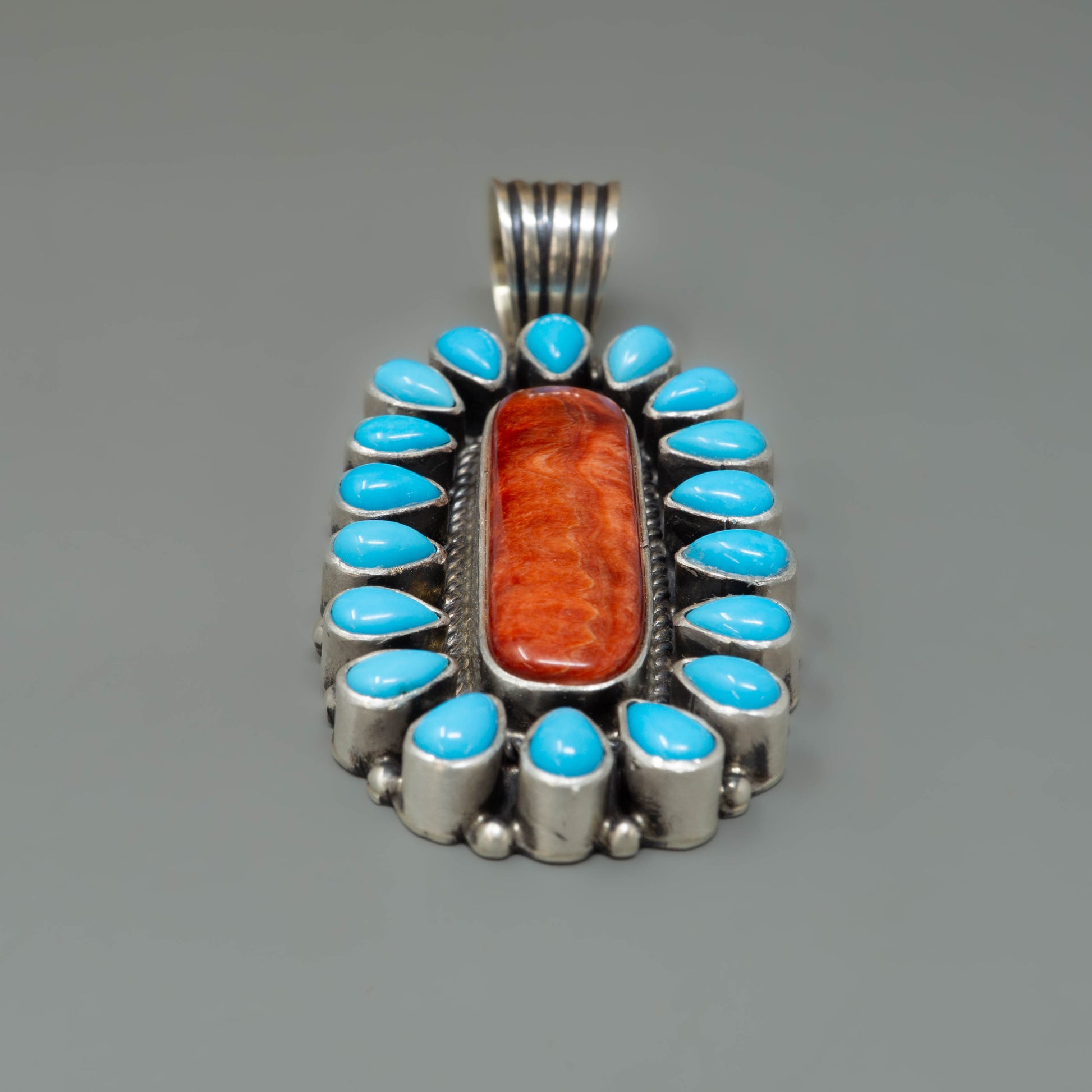 This Navajo Pearl necklace features a pendant including 18 teardrop pieces of Sleeping Beauty Turquoise and one large oval piece Spiny Oyster all set in sterling silver.