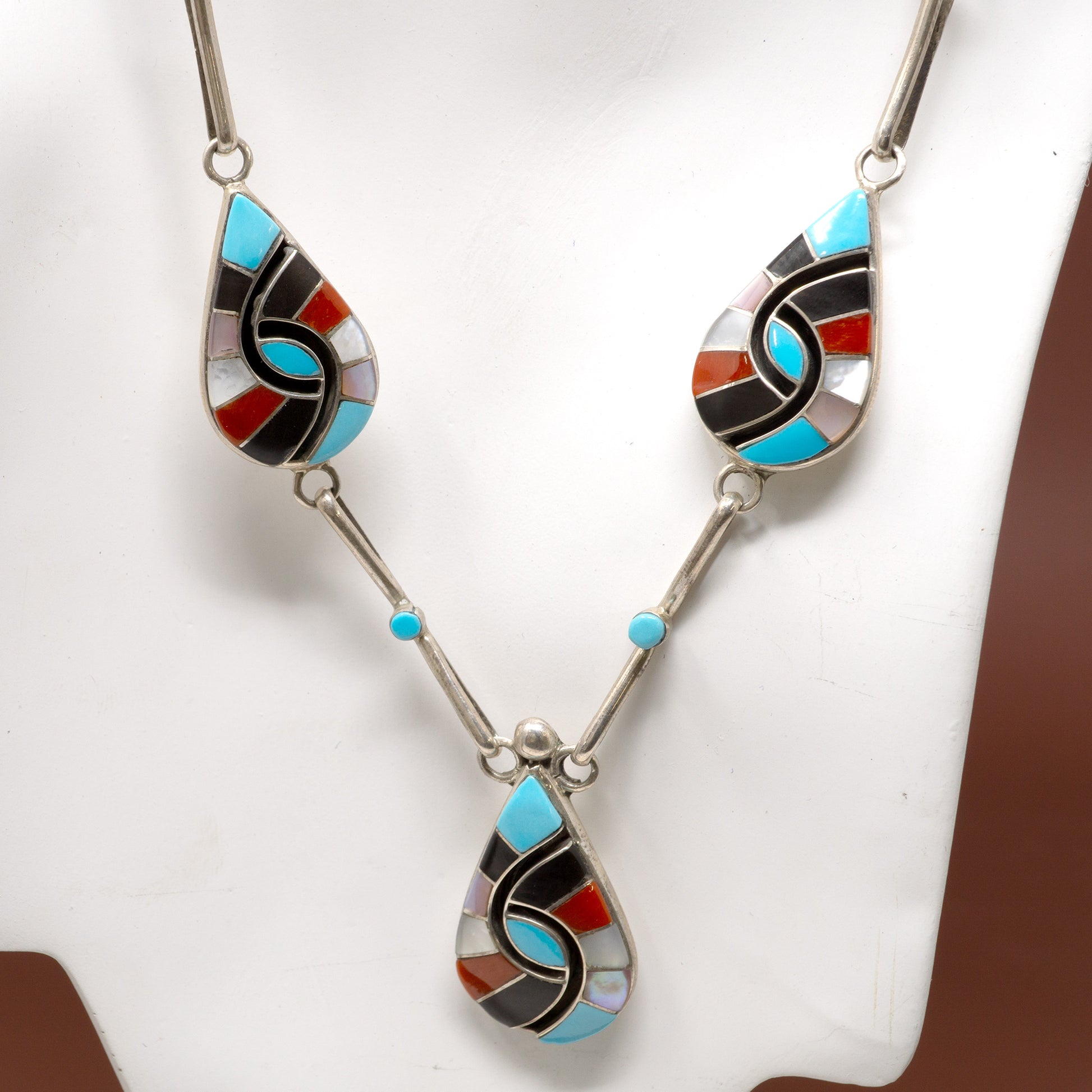 Sleeping Beauty Turquoise, Coral & Abalone 3 Teardrop Inlay Pendant Linked Necklace and Earring Set