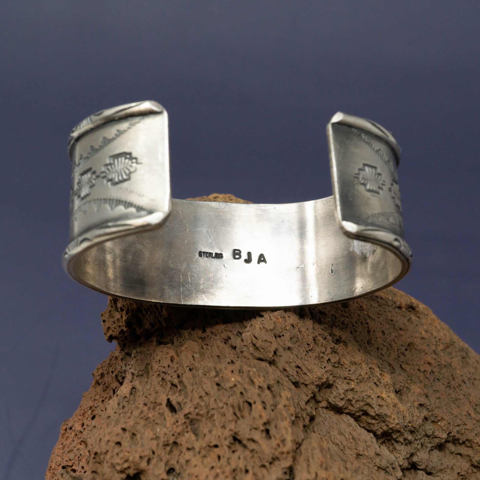 Excavated from the Sleeping Beauty Turquoise Mine in Globe, Arizona until 2012, this rare gem is sought after for its solid sky blue hue. This piece created by Boyd Ashley features 5 high-grade Sleeping Beauty Turquoise stones that harmonize perfectly with the stamped decorations on the cuff. Our Sleeping Beauty Turquoise & Sterling Silver Cuff Bracelet is the perfect addition to any jewelry collection!