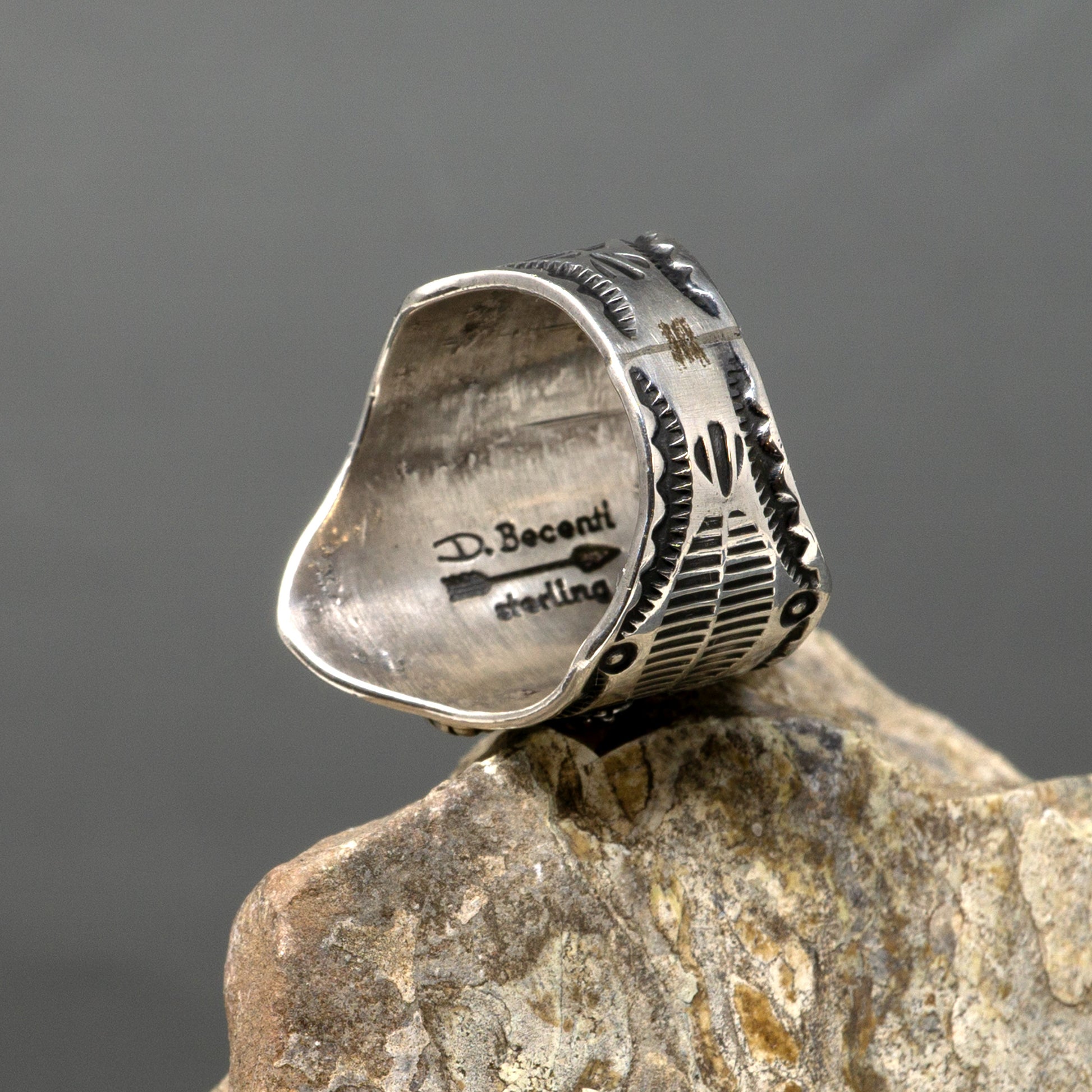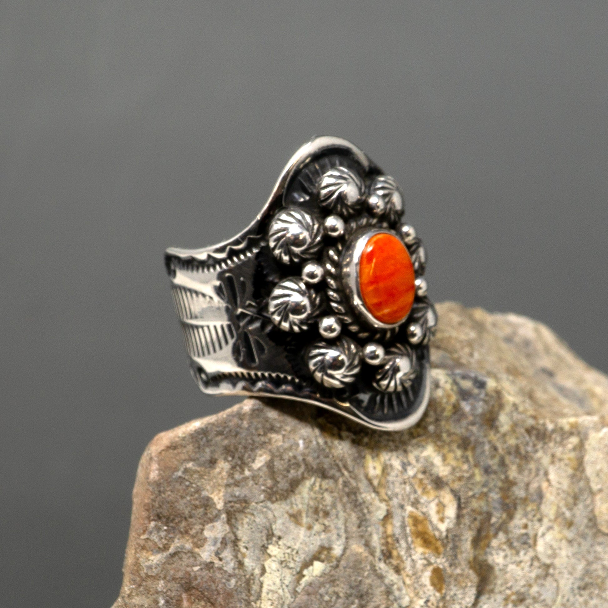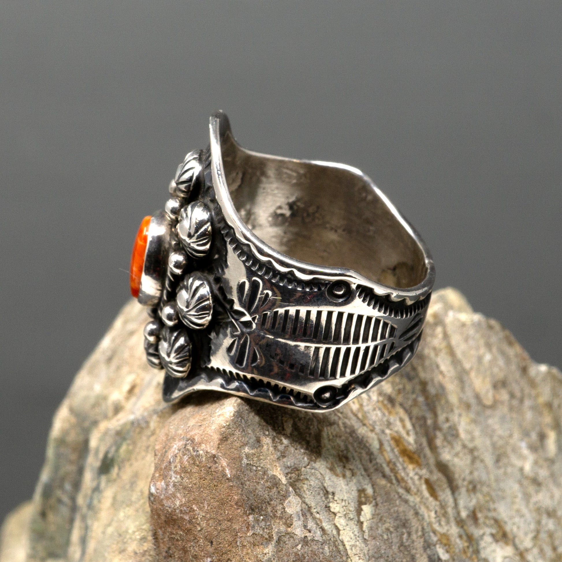 Stamped Silver Ring with Spiny Oyster Cabochon by Darryl Becenti | Size 9.5