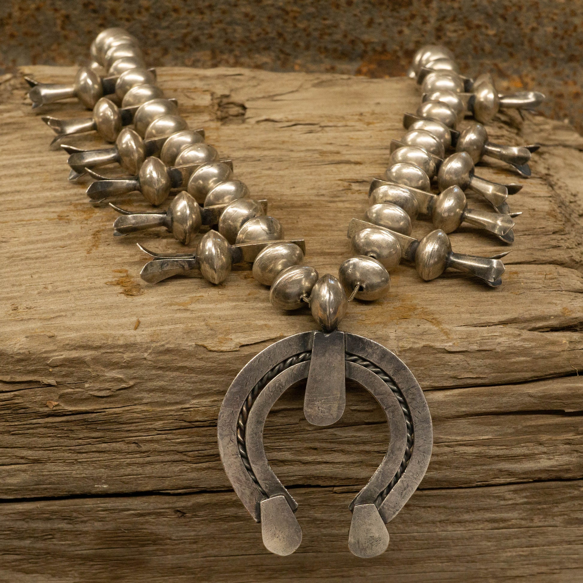 Vintage Navajo Squash Blossom Naja Necklace with Kingman turquoise and Navajo Pearls