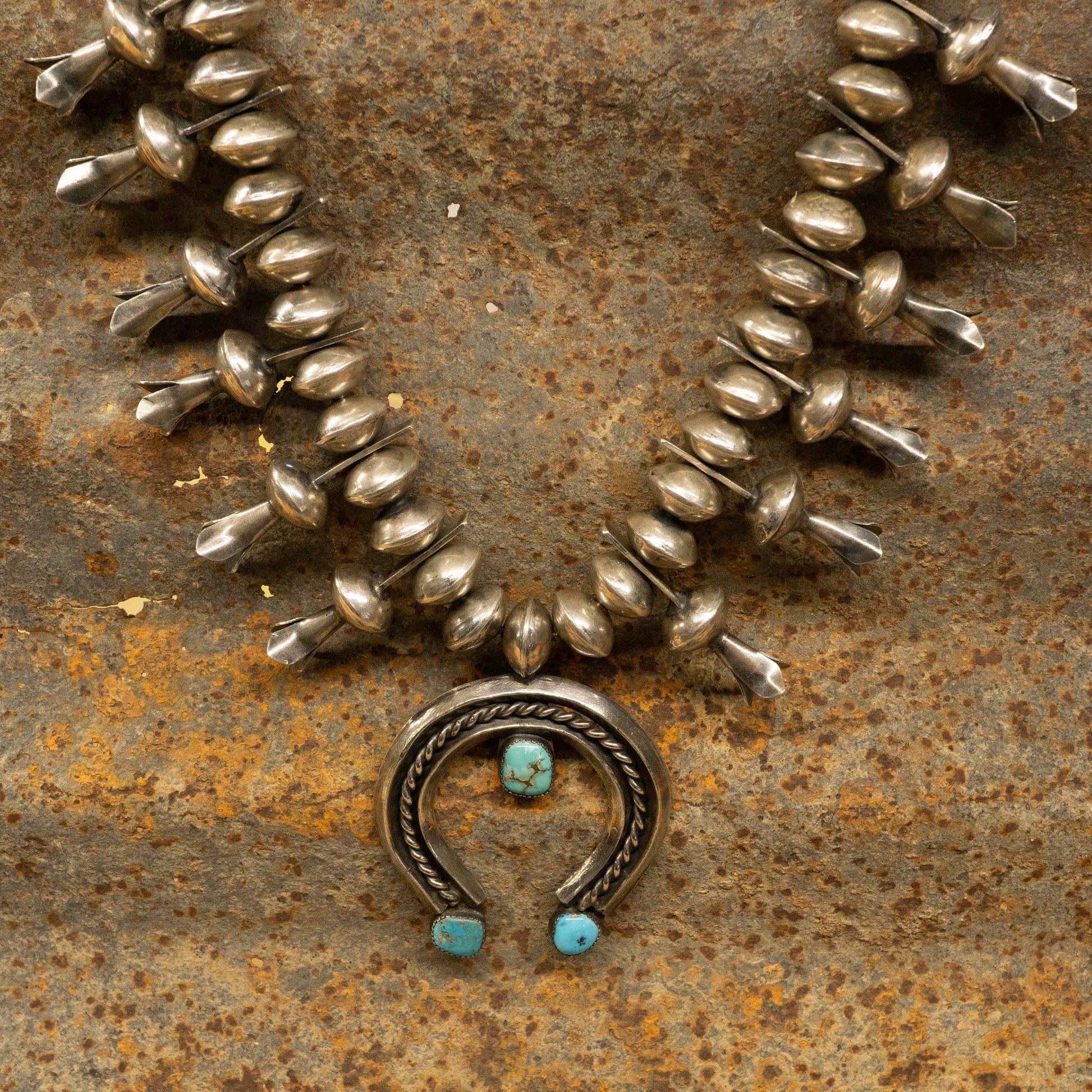 Behold this incredible vintage squash blossom necklace complimented with Navajo Pearls and Kingman turquoise. A true treasure!